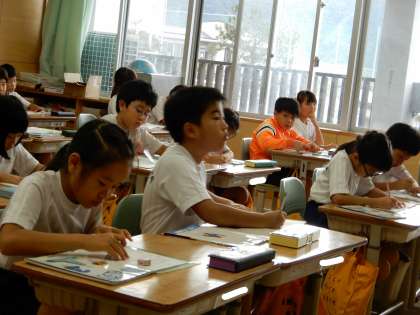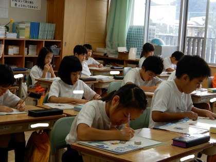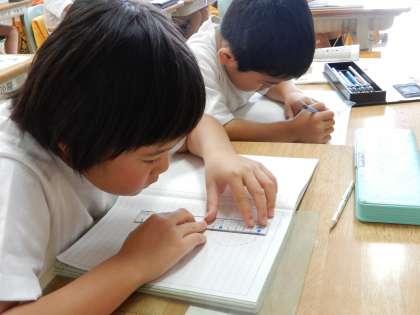 「円」について学習しています。まずはコンパスを利用しないで、円を描いています。中心から3センチを定規で測って点をたくさん作っています。