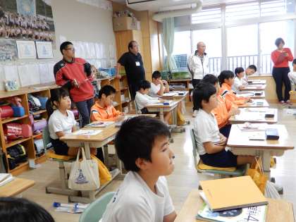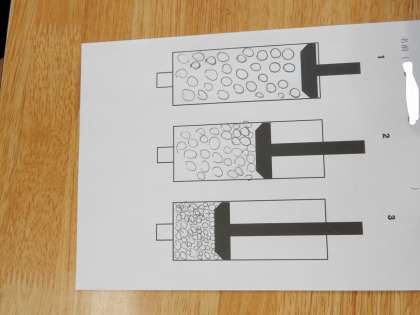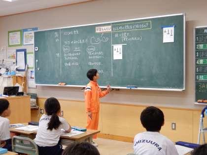 縮んだ空気の様子ってどんなものだろうか。押したときの空気はどうなっているのか。言葉だけではなく、イメージ図を描くことに挑戦しています。なかなか、子供たちの発想が素晴らしいです。