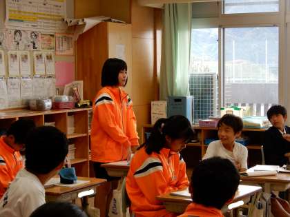 「みかん」のキャッチコピーを考えました。一人ずつみんなの前で発表しています。なかなか力作があります。