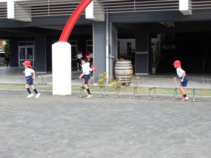初志部はプレイグラウンドで朝トレ頑張っています。5、6年生はマラソンを頑張っています。