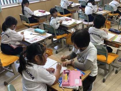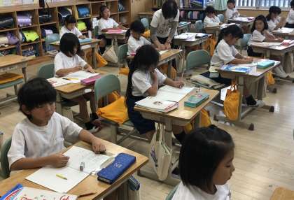 1Aの数学では、繰り上がりの練習を兼ねて2桁になる足し算の練習をしています。足して10になる数字の組み合わせを考えながら取り組んでいます。