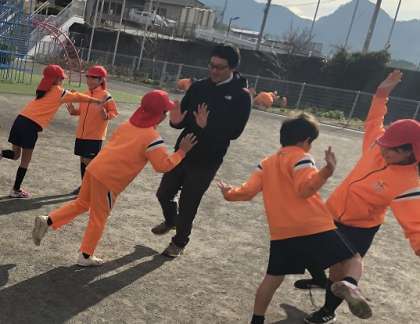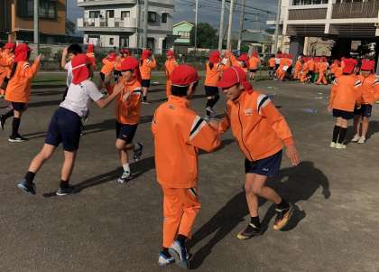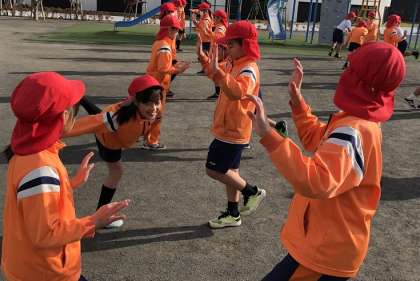 4Aの体育は、プレイグラウンドで行いました。楽しそうにウォームアップ運動をしています。
