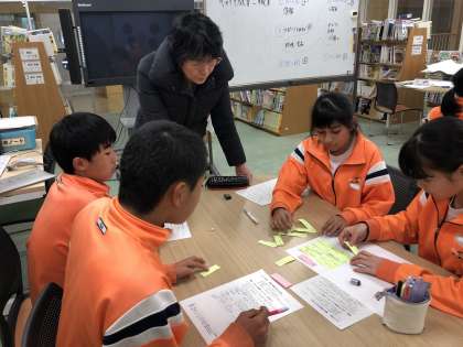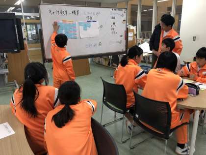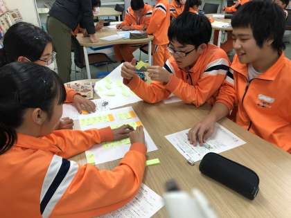 7Bの総合では、キャリア教育の一環として職業の種類について学んでいます。本日の授業では、職業を5つのジャンルに分け、各班でどんな職業があるか考えて、みんなの前でプレゼンしています。