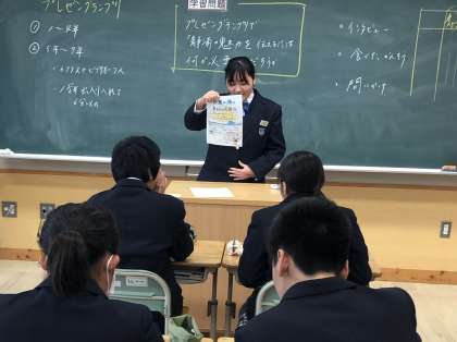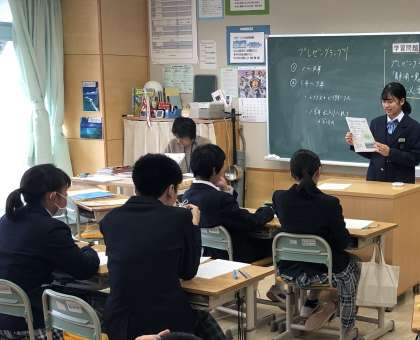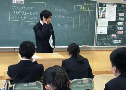 8Aの総合では、プレゼン学級発表をしています。“静浦の魅力を伝えるには何が必要なのか”というテーマで制限時間内にプレゼンテーションをしています。各自で作ったプレゼン資料を元に、パフォーマンスも織り交ぜながら静浦の魅力を伝えています。