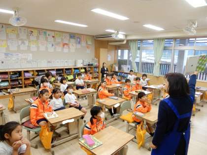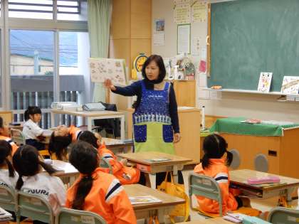1Aは中村先生の楽しいブックトークです。節分が近くなってきたので、「まめ」に関係した絵本を紹介しています。「おとうふは、まめからつくられている」と「えー」と。皆さん「まめ」にはたくさんの種類がありますよ。中村先生ありがとうございました。