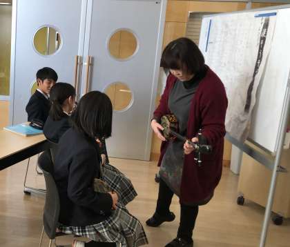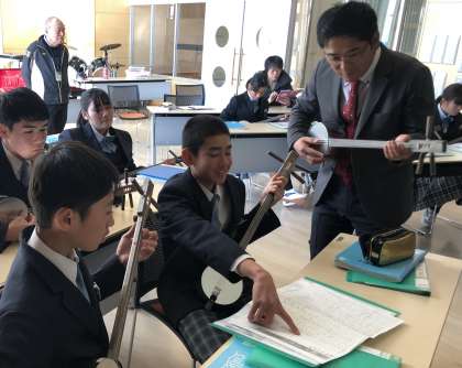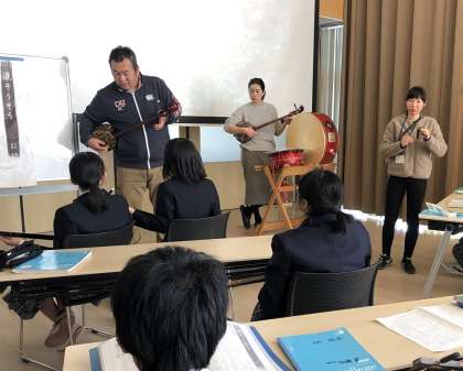 本日、8Aは“沖縄文化体験教室”を実施しました。久米島観光大使の小川さんと武藤さんを講師にお招きし、沖縄の伝統楽器“三線”の演奏に取り組みました。キラキラ星や涙そうそうを演奏し、短い時間でしたが子どもたちもかなり上達しました。授業の終わりには、みんなで歌ったり、演奏したり、みんなで琉球民謡“ユイユイ”を踊ったりして充実した時間を過ごしました。小川さん、武藤さん、お忙しい中ありがとうございました。