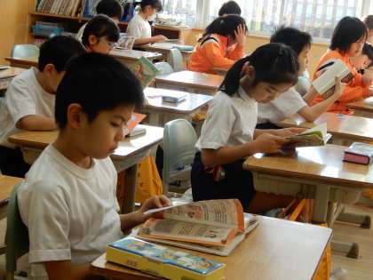 朝読書の様子ですが、1年生は図書館で、2Aは教室で読書です。恵まれた施設に感謝です。