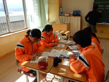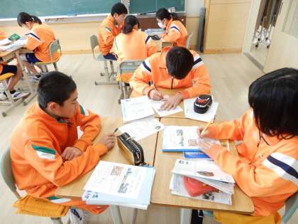 近代革命の時代(その頃日本は江戸時代)について学習しています。イギリスの名誉革命、アメリカの独立宣言、フランス革命について3つに分かれてジグソー学習です。みんな自分の意見を仲間に説明しています。
