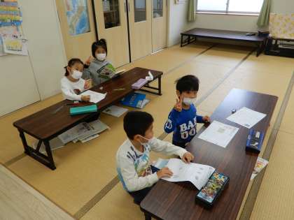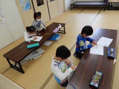 静甫放課後児童クラブです。9時の段階で4人の子供たちが学習しています。落ち着いて学習して大変立派です。学校として図書館や体育館、プレイグラウンドなどの利用も認めています。