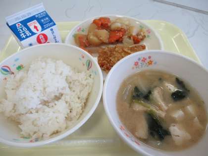 今日のメニューは、いかの更紗揚げ、じゃがいもと野菜の炒め煮、大根のみそ汁、麦ごはん、牛乳です。