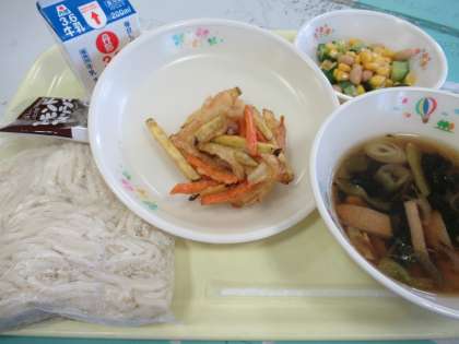 今日のメニューは、かきあげうどん、大豆とコーンのサラダ、牛乳、アーモンド小魚です。