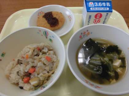 今年、最初の給食です。 メニューは、ふきよせおこわ、だいずコロッケ、わかめスープ、牛乳です。