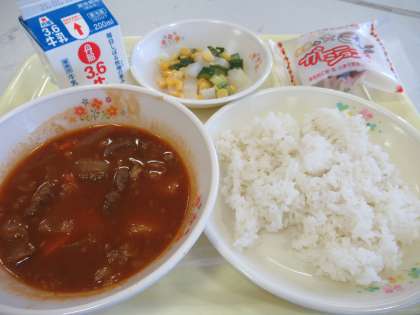 今日のメニューは、ビーフシチュー、大根とコーンのサラダ、麦ごはん、ガトーショコラ、牛乳です。