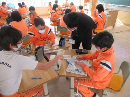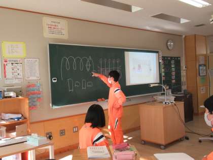 前回、班で話し合った「コイルの周りの磁界はどうなっているのか」を発表しています。