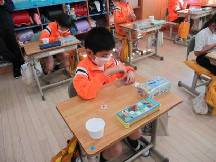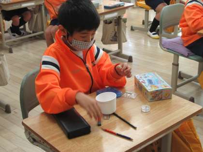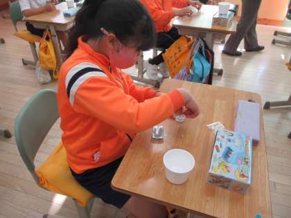 磁石についた鉄くぎを磁石からとっても磁石の力があるか、砂鉄、方位磁針、磁石に付けたことのない鉄くぎで調べています。