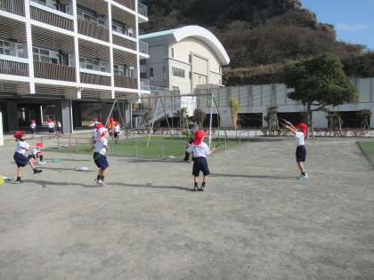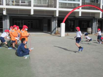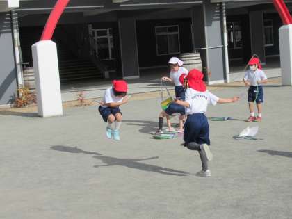 休み時間には、プレイグラウンドでなわとびをする子どもが大勢います。