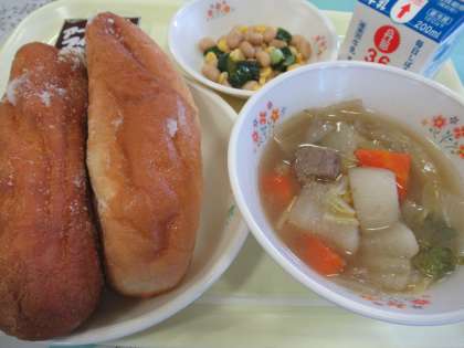今日のメニューは、きなこ揚げパン、ポトフ、大豆とコーンのサラダ、牛乳、アーモンド小魚です。