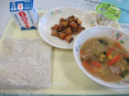 今日のメニューは、みそラーメン、サツマイモと小魚の揚げ煮、牛乳、丹那プリンです。