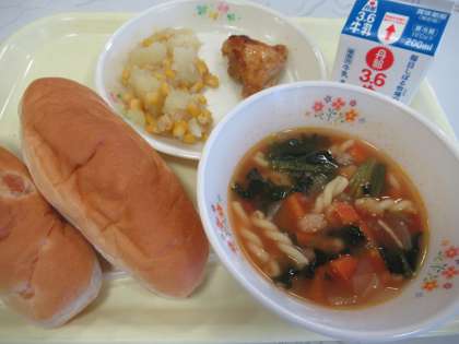 タンドリーチキン、ポテトとコーンの洋風煮、ミネストローネ、りんごチップ入りロールパン、牛乳です。