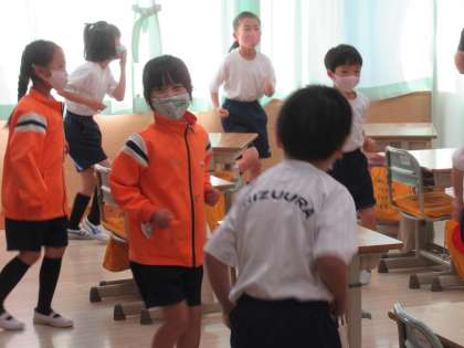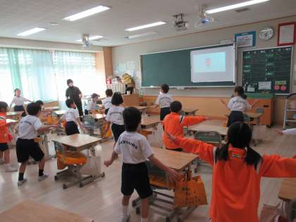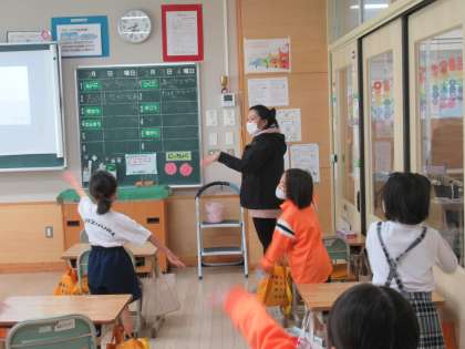 ALTのチェルシー先生と一緒に、英語の歌を歌いながら踊っています。