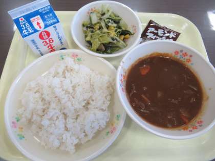 今日のメニューは、ハヤシライス、野菜炒め、牛乳、アーモンド小魚です。