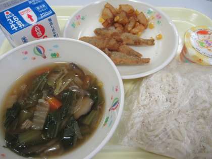 今日のメニューは、ちゃんこうどん、小イワシフライ、ポテトとコーンの炒め物、牛乳、豆乳プリンです。