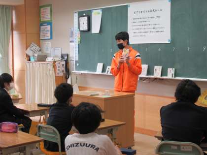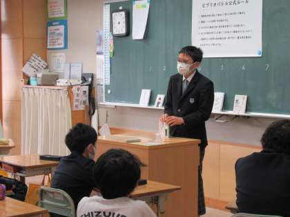 8Bの生徒が、5年生に向けてビブリオバトルを行っています。