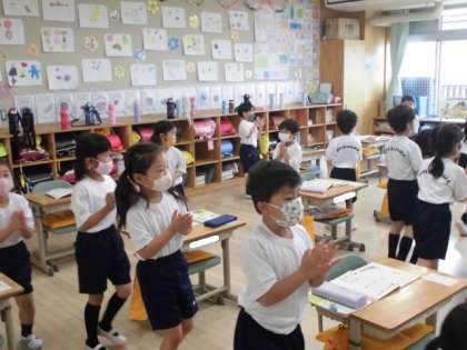 「かば さん の さんぽ」先生と一緒に、リズムに合わせて、かばさんのさんぽを暗唱しながら教室内を移動します。読み終わったときに、自分の席に帰ってくることができたかな。