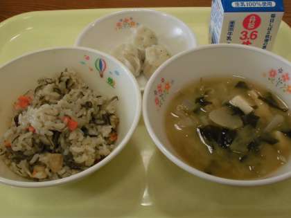 今日のメニューは、鶏たきこみご飯、しらす入りしゅうまい、新玉ねぎのみそ汁、牛乳です。