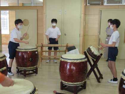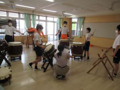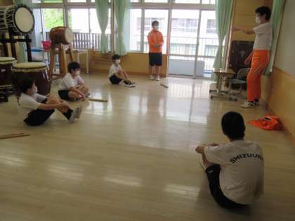 文化芸術部では、部長から、文化芸術部についての説明があり、いよいよ太鼓の演奏です。すでに演奏を経験している子もいるようで、なかなかさまになっています。