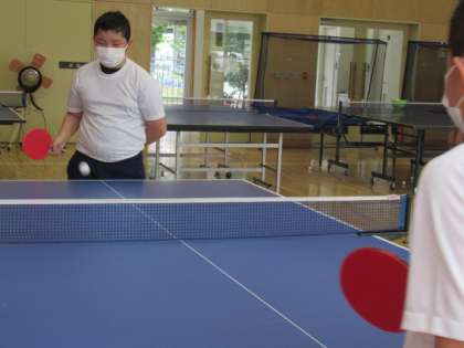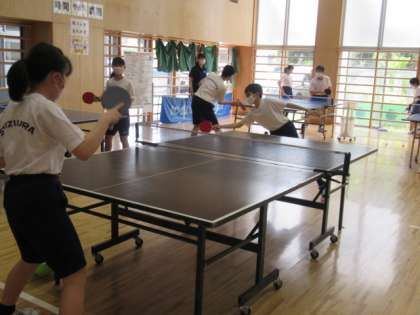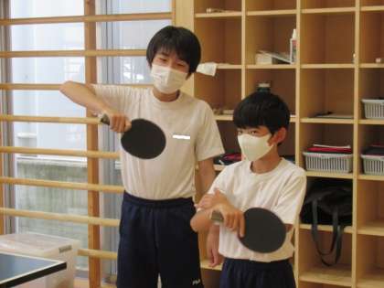 卓球部は、7〜9年生の先輩が、6年生に、ラケットの扱い方や打ち方をていねいに教えていました。先輩との打ち合いでは、うまくいかなくても、「だいじょうぶ、だいじょうぶ!」「○○すればいいよ。」と、先輩方が励ましてくれていました。