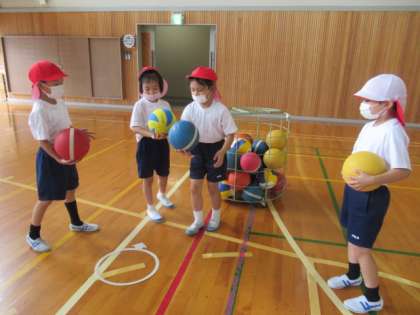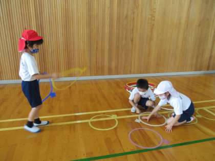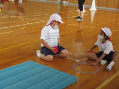 2Aの体育では、いろいろな器具を使った運動作りに取り組んでいました。どのような動きにしたらいいのか、どのくらいの回数にするのか、グループで話し合って決めていました。
