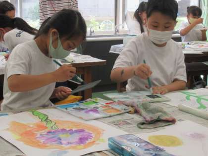 4Aの図工では、自分が想像した「まぼろしの花」を描いていました。いろいろな技法を使って彩色を工夫していました。