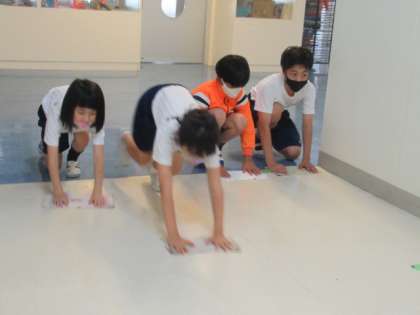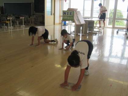 ろうかの担当は、上級生がはいたところを、下級生が一生懸命にぞうきん掛けをしていました。