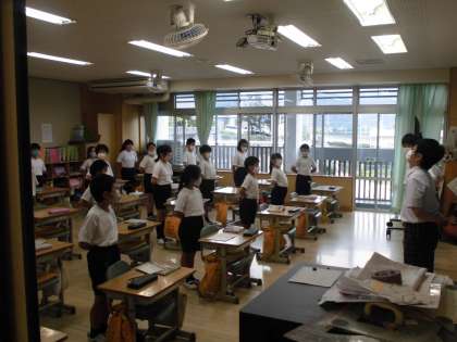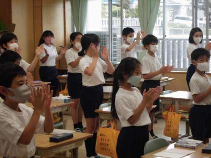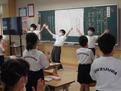 今朝も立志部の応援団員が、激励会の練習のために、3・4年生の教室を訪れました。応援団員の指示に従って、姿勢や拍手のタイミングなどを確認しました。4年生の教室の様子です。