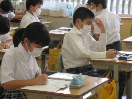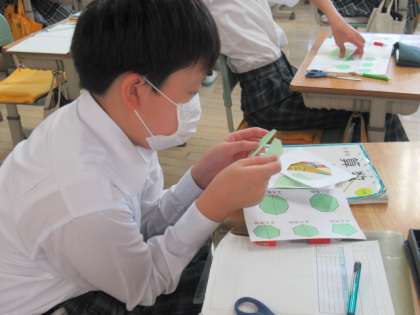 正多角形を、点対称や線対称の特徴を使って調べていました。実際に、正多角形に線を引いたり、はさみで切ったり操作しながら学んでいました。