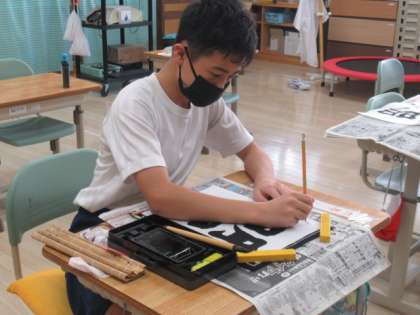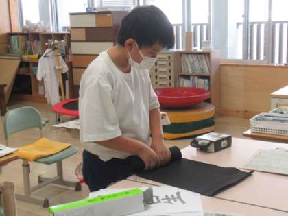 書写の授業です。姿勢を整えて、半紙にバランスよく字を書くことができました。