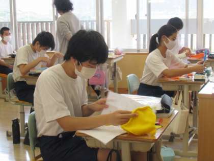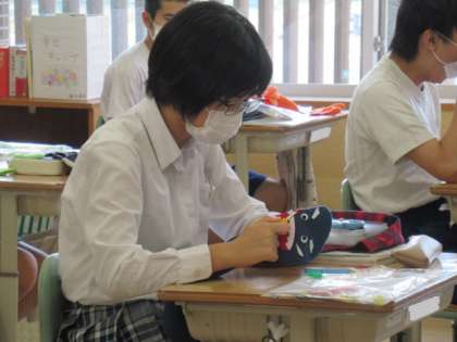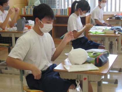 9年の家庭科では、ぬいぐるみを作っています。縫う場所に合わせた縫い方の技法を使って、丁寧に縫い進めていました。仕上がりが楽しみです。
