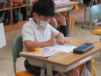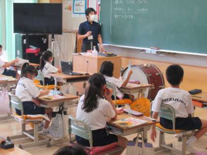 3Aの理科では、音の伝わり方の学習でした。教室には、大だいこやカスタネットなど、音が鳴るものが準備されていました。