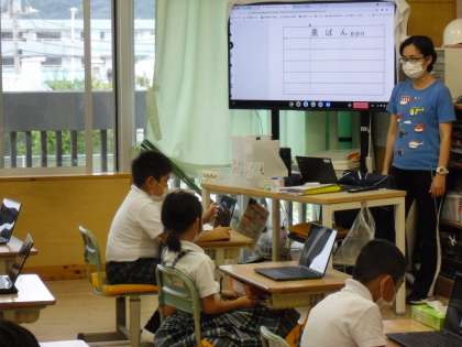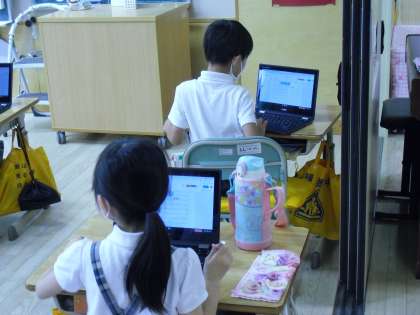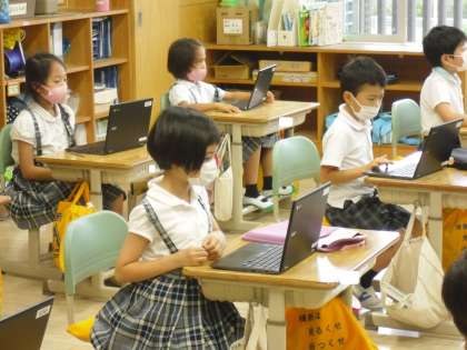 ChromeBookを使って、かかりカードを作ります。まずは、先生の説明を聞いて、これからの活動を確認しています。