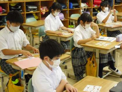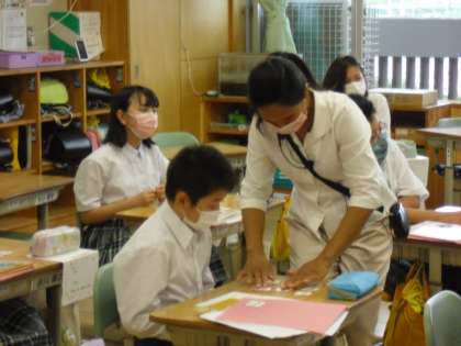 ALTの先生も加わり、What subjects do you like ? I like ○○. の英会話をカードを使って練習していました。教科のカードを、ビンゴ形式でめくっていくゲーム形式で、教室の雰囲気はたいへん盛り上がっていました。