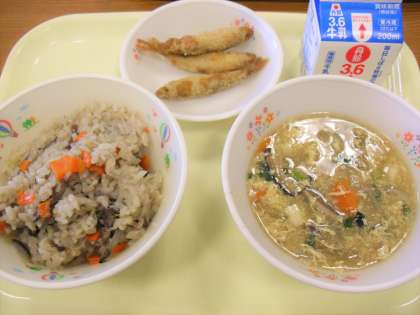 今日のメニューは、すき焼き風炊き込みごはん、わかさぎフライ、かき玉汁、牛乳です。ふるさと給食として、すき焼き風炊き込みごはんには、愛鷹牛が使用されています。