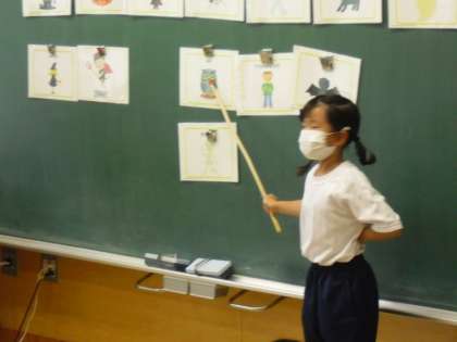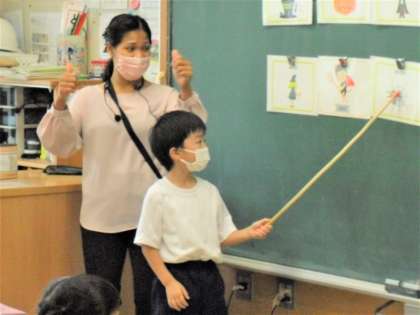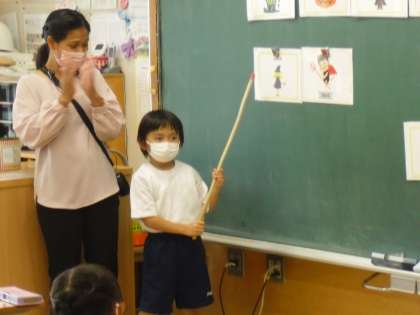 ハロウィンにちなんだものを英語で発表しています。ALTの先生の発音をよく聞き、正しく発表できました。先生から大きな拍手がおくられています。