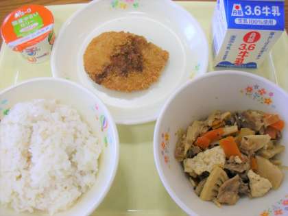 今日のメニューは、肉どうふ、ぶりフライ、麦ごはん、やさいゼリー、牛乳です。
