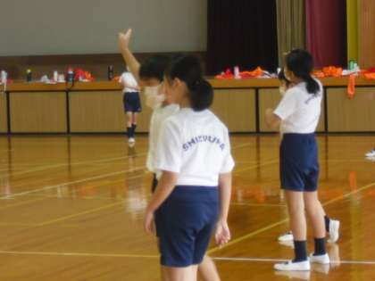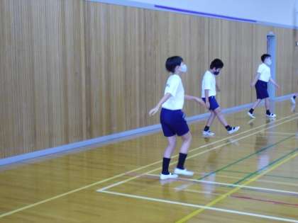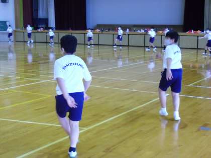 体育館いっぱいの輪になって、ダンスの練習です。現代の音楽に、フォークダンスの踊りをミックスしています。