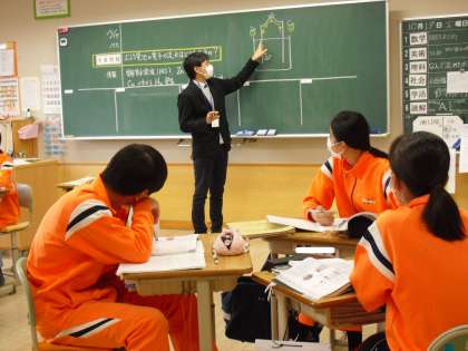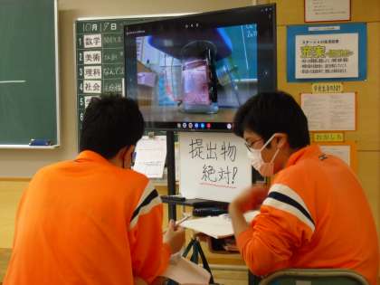 「ボルタ電池の電子の流れはどうなっているの?」モニタの映像を見ながら、グループで考えを交換しています。