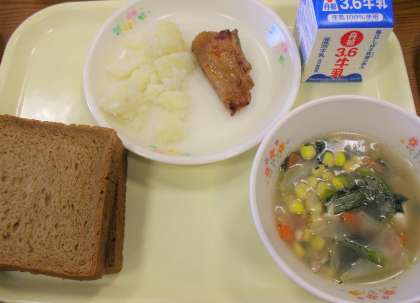 今日のメニューは、とり肉のチリソース焼き、粉ふきいも、ベーコンとキャベツのスープ、黒糖入り食パン、牛乳です。