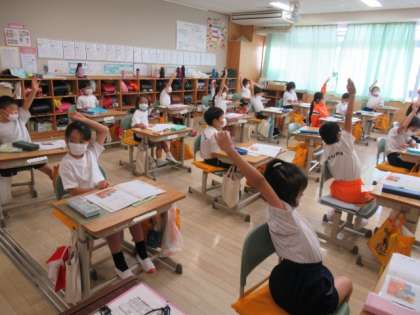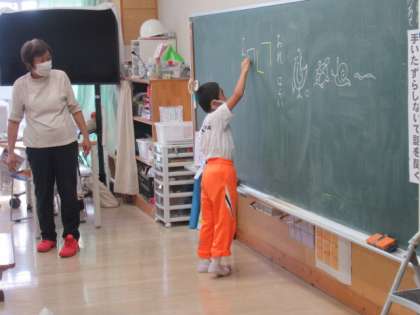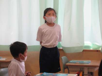 書写では、「おれ」「はらい」など、漢字を書くときに注意するところを確認していました。「おれ」や「はらい」のある漢字を出し合う場面では、みんなが勢いよく手を上げていました。