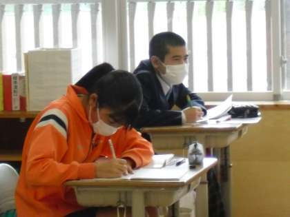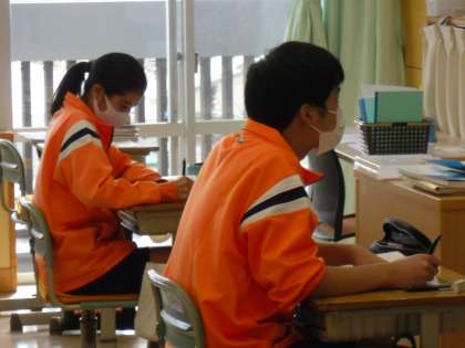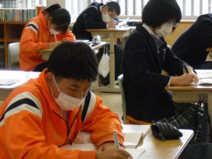 新古今和歌集について学習していました。鎌倉時代前期のもので、八番目の勅撰和歌集であることなどの説明を聞き、熱心にノートに書きこんでいました。