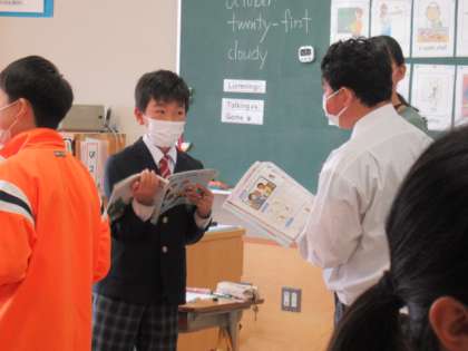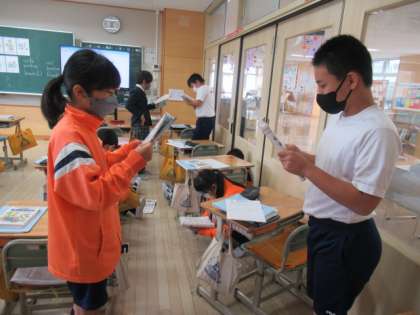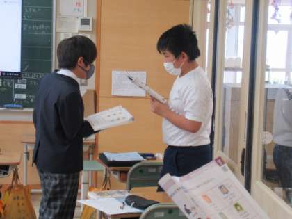 6年生の英語では、男性は、「He is〜.」、女性は、「She is〜.」をつかって、紹介をすることを学び、ペアになって、それを確認し合っていました。